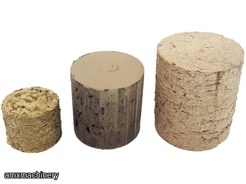 Waste with a maximum moisture content of 18 % from wood, straw, miscanthus (elephant grass), paper, cardboard, containers, plastics and textile fibres can be converted into briquettes with the briquetting presses. The pressing works by means of hydraulic pressure without adding any additives or glue.