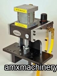 La Cortadora Neumatica de Esquinas corta esquinas, agujeros y ranuras en placas, gafetes, señales y otros articulos. Estas unidades son para esquinas hasta de ½” de tamano, no es para los formatos grandes de ¾” y 1”. Se activa con un pedal de piso en cada corte, el poder de corte de la maquina se ajusta con el regulador de aire que viene en la prensa, incluye tambien un manometro, filtro y valvula de escape, presion de aire requerido 40 PSI.