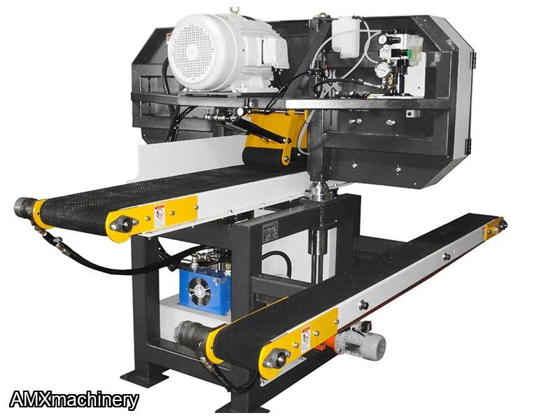 Capable of resawing large timbers with precise results. With its powerful 30HP variable speed saw motor and variable speed hydraulic feed system the HR400PB can be optimized for any job. Equipped with a large cutting capacity up to 15 ¾” wide and up to 9.8” thick. The saw assembly is raised and lowered electronically using a digital input controller for precise thickness setting. All controls are conveniently located next to the infeed conveyor for operator convenience.