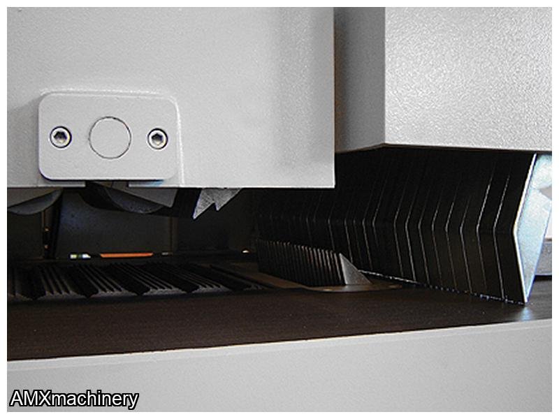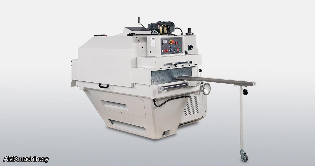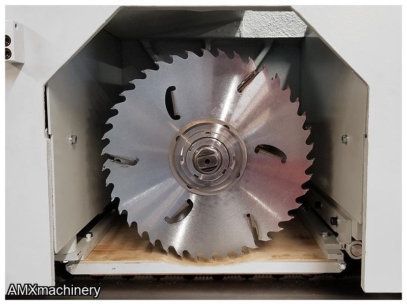 Is a true production multi ripsaw with an industrial cast iron machine body. The precision cast iron chain and track system allows for maximum durability and precision resulting in superior cut quality and accuracy. The removable saw sleeve system allows for fast changeovers between ripping operations leading to increase throughput. Is also equipped with a powerful 50HP standard saw motor for maximum cutting depth with multiple rip blades and increase feed speeds. A minimum ripping length of 11.8” can be achieved with the optional short stock attachment.