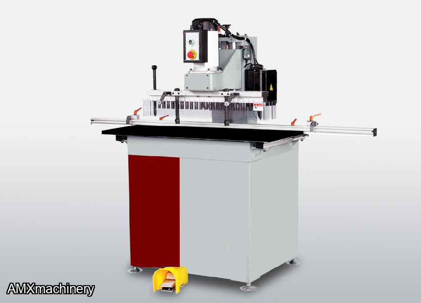 Is designed to speed up your line drilling operations. It has a total of 21-spindles based on a 32mm centers.  The spring-loaded index pin allows for accurate and convenient continuous line drilling operations.  The precision rear aluminum fence with linear scale and (2) flip stops allow for precise and convenient setup.  The complete back fence can be adjusted for various measurements from the edge of the panel to the holes.  The precision boring head has interlocking steel gears with alternating spindles and accepts industry standard boring bits with 10mm shank.  The convenient foot pedal initiates the drilling cycle so your hands can quickly adjust the workpiece to the next operation.  The drilling unit moves up and down on high carbon anti-friction steel shafts with linear bearing for effortless movement.